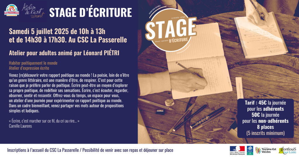 Venez (re)découvrir votre propre rapport poétique au monde ! La poésie, loin de n’être qu’un genre littéraire, est une manière d’être, de respirer. C’est pour cette raison que je préfère parler de poétique. Écrire peut-être un moyen d’explorer sa propre poétique, de redéfinir ses sensations. Écrire, c’est écouter, regarder, observer, sentir et ressentir. Offrez-vous du temps, un espace pour vous, un atelier d’une journée pour expérimenter ce rapport poétique au monde. Dans un cadre bienveillant, venez partager vos mots autour de propositions simples et ludiques.